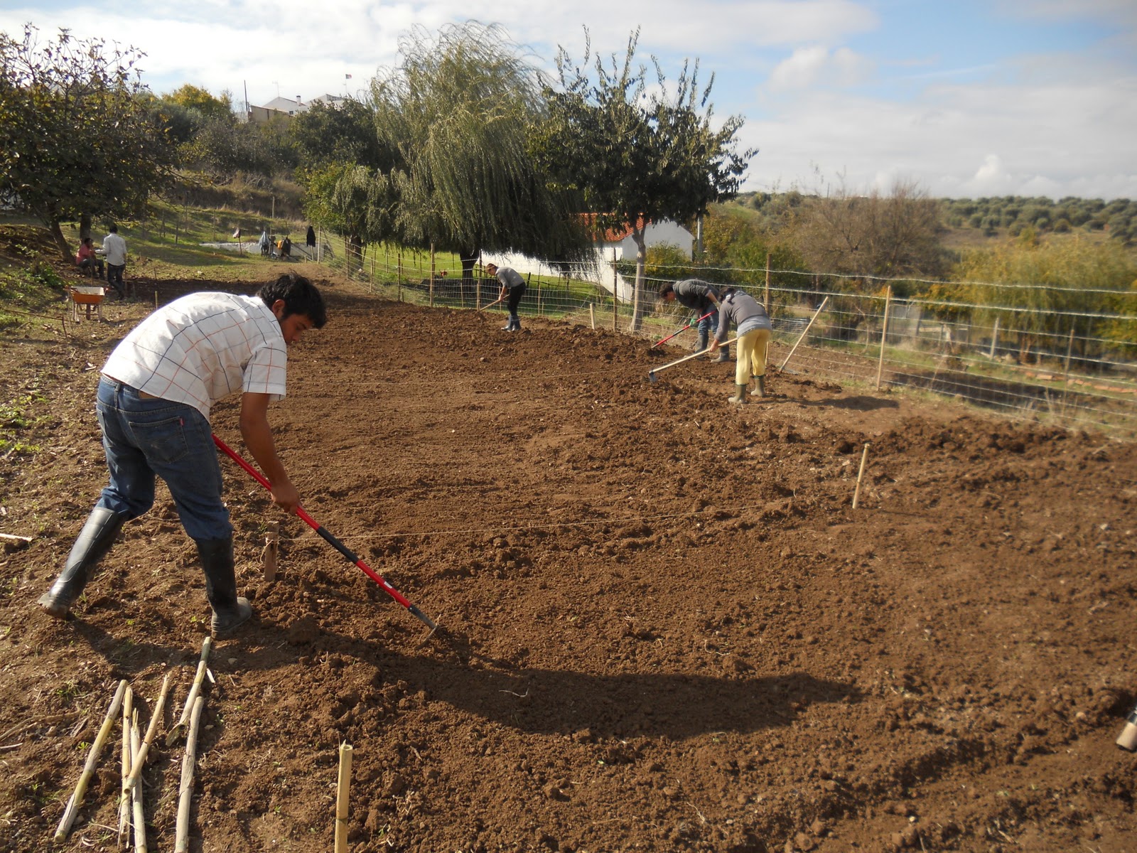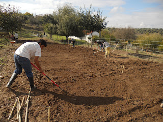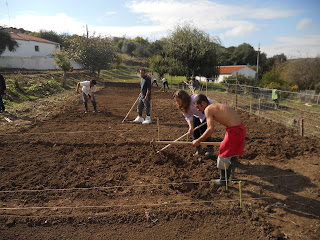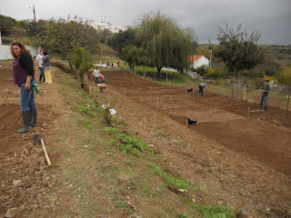 1.Fez ontem um mês que iniciámos o curso. E nada melhor para comemorar a data do que iniciarmos os trabalhos agrícolas na horta, com a delimitação dos talhões, a mobilização e preparação do solo e a sementeira de ervilhas e favas. O dia esteve perfeito para as várias tarefas, ameno, seco e com uma luz única.
