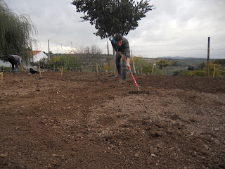 1.Fez ontem um mês que iniciámos o curso. E nada melhor para comemorar a data do que iniciarmos os trabalhos agrícolas na horta, com a delimitação dos talhões, a mobilização e preparação do solo e a sementeira de ervilhas e favas. O dia esteve perfeito para as várias tarefas, ameno, seco e com uma luz única.