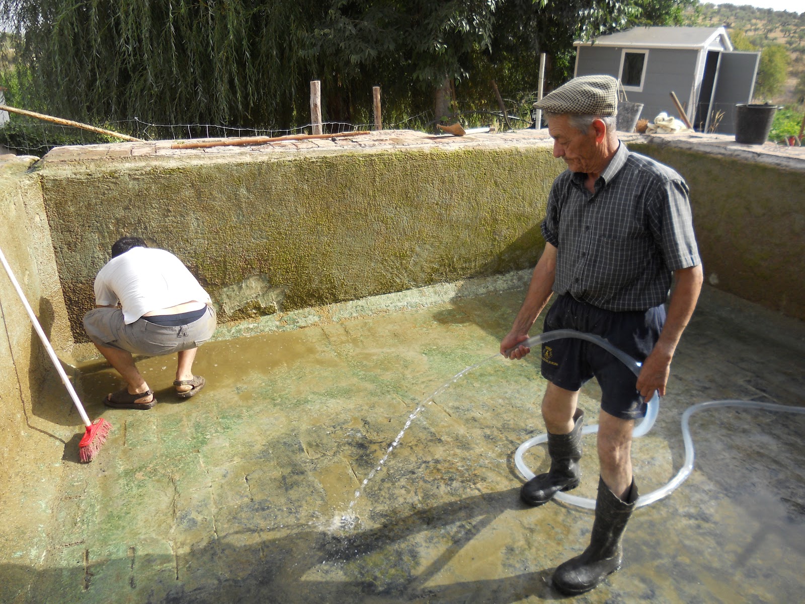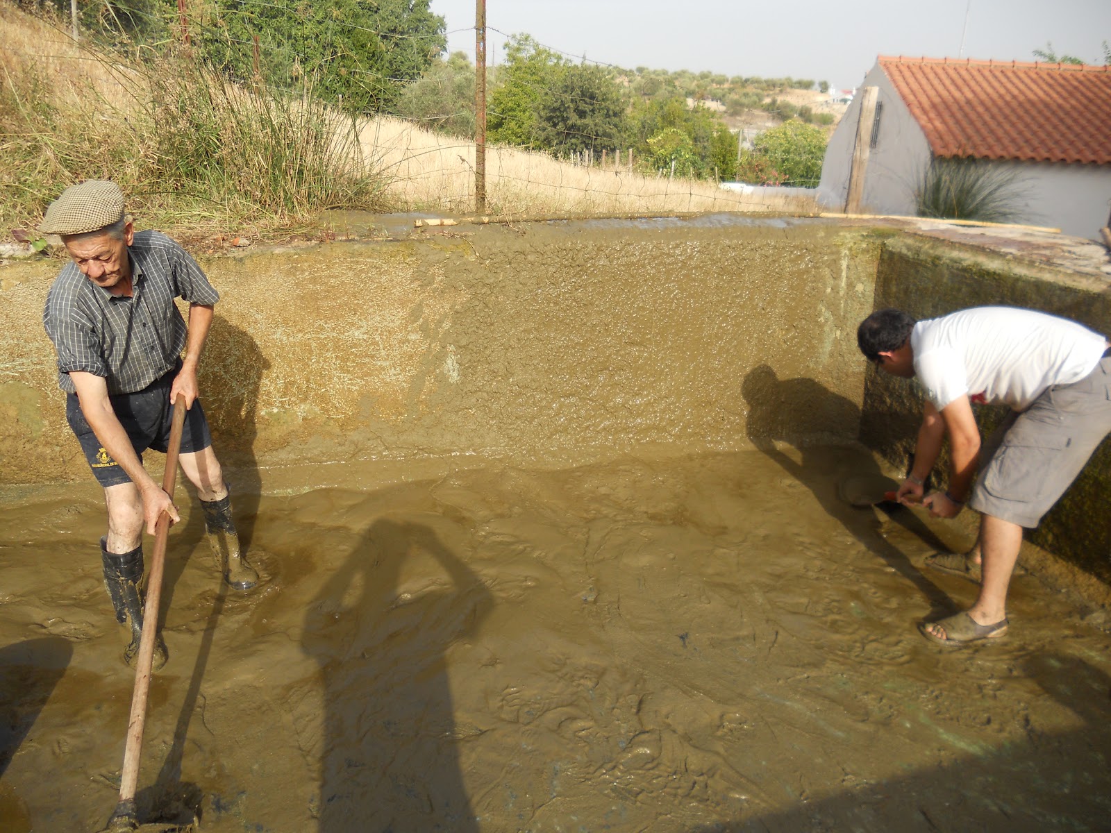 E agora, algo completamente diferente. Nesse dia em que eram esperados 41 graus em Moura, três hortelãos declinaram sementeiras e sachas em favor de algo mais consonante com a canícula. Depois de aboborarem a ideia peregrina, decidiram ir a banhos..., engolfando-se no tanque da horta! Enfim, podia dar-lhes para pior. Longe da ideia que fazemos do mar coralino das Caraíbas, o reservatório de água turva garantia no entanto refrigério q.b. e um terapêutico banho de lama, dos pés à cabeça. Vantagens que foram levadas em conta pelos três hortelãos quando decidiram unir esforços e não adiar mais a limpeza do tanque. Condizentes com a tarefa, usavam calçado anti-derrapante e empunhavam espátulas, escovas, pás e baldes. Ainda tentaram dosear o estrondo da entrada, mas não evitaram que o alvoroço das quietas águas tomasse formas de tsunami para rãs e insectos à deriva e envolvesse no remoinho o cardume de carpas e barbos residentes. Duas horas depois e os baldes entravam finalmente em acção no transvase dos últimos litros de água, mais lodo, limos e pedras que água, de um total de cerca de 20 mil que o tanque armazena.  E antes que perguntem qual o destino dos peixes, é melhor que se comece pela sorte das rãs. Ora tanto esbracejaram ao sabor das correntes e na crista das vagas provocadas pela movimentação dos humanos, que vieram, aturdidas, às suas mãos mais cedo do que se pensava. Foram recuperar no exterior do tanque, na poça junto à torneira de saída. Os peixes acabaram por dar mais luta, espadanando o que restava do seu ambiente natural até se imobilizarem, esfalfados, numa espécie de pego. Mesmo assim não foi fácil fazer a sua trasfega para os dois bidões que os esperavam atestados de água. Um mínimo safanão de barbatanas escorregadias, e era o bastante para se escaparem por entre os dedos. Depois veio a corrida contra o tempo, retirar as últimas lamas, iniciar o enchimento, garantir um mínimo de água navegável e devolver as criaturas sãs e salvas. Um dia depois, tanto quanto demora a encher o reservatório, viemos encontrar os nossos dezoito peixinhos da horta felicíssimos da vida, emborcando, a plenas guelras, uma água agora bem oxigenada e cheia de reflexos azuis. Tão apetecível, que dava vontade de um mergulho. De um mergulho a sério.