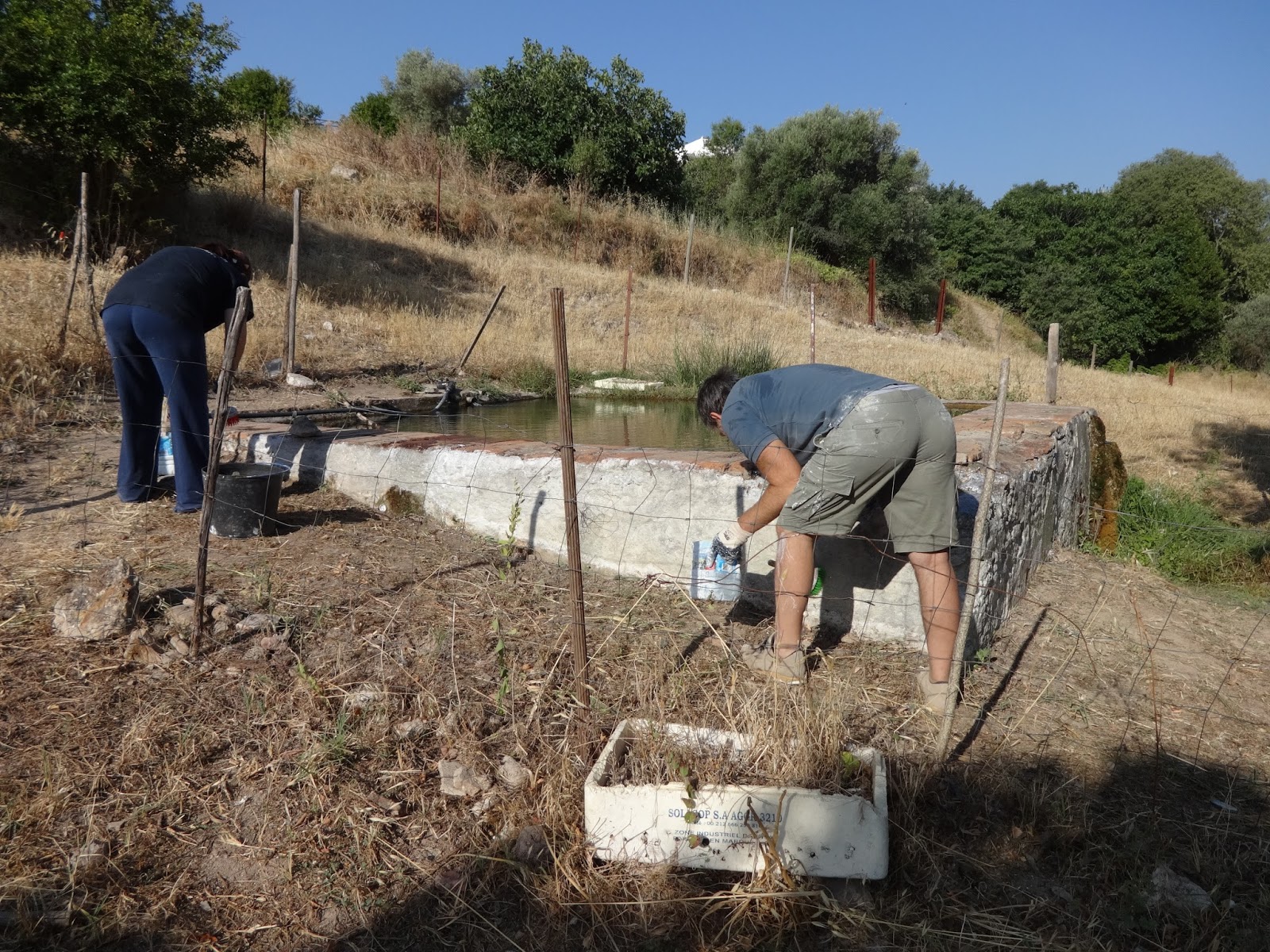 Julho 2012 - Há quanto tempo o tanque não era limpo? Quase trinta centímetros de lama e pedras, sendo que uma ou outra entupiam o cano de saída da água, deixa perceber que há muito, seguramente. Três hortelãos meteram então mãos à obra, dragando o fundo à procura de pedras e baldeando água lamacenta até as baldosas ficarem a descoberto, luzidias. Pronto a receber vinte mil litros de água bem oxigenada e cheia de reflexos azuis, o tanque voltaria a ser o abrigo dos nossos dezoito peixinhos da horta, entre barbos, carpas, bogas e pimpões.